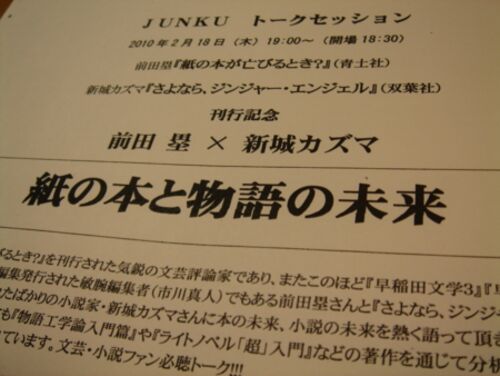 ■ 出演 前田 塁(文芸評論家) 新城カズマ(小説家) ■ 日時: 2010年2月18日(木)19:00〜21:00 ■ 会場 : ジュンク堂書店新宿店8階喫茶コーナー 《感想文:出版業界再編について考える》 新城カズマさんはジュンク新宿初登場だったのですが来てもらって本…